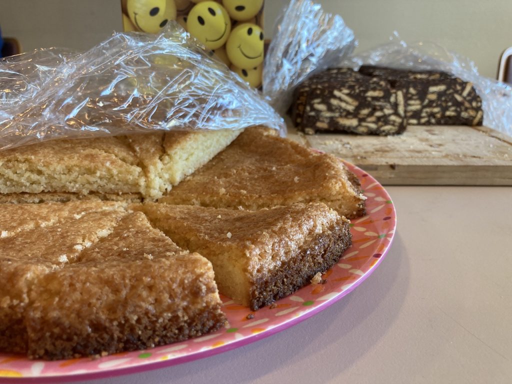 - Laat je kokoskoek een paar uur afkoelen, anders valt hij uit elkaar met aansnijden. Niet omdat hij niet stevig genoeg bakt, maar de boter is nog warm en moet nog afkoelen en steviger worden